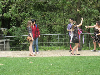Procedemos a ir para a zona do parque infantil, onde iria decorrer um quiz. Não me inscrevi porque, na verdade, apesar de ter visto tantos animes, não sou muito boa com quizzes. Nunca me lembro das respostas para as coisas! Na verdade, na maior parte das vezes nem sequer me lembro se já vi os animes ou não. :( Mas foi muito engraçado assistir ao quiz, que estava misturado com um "jogo do lenço", porque afinal até sabia a resposta para bastantes coisas. :) E é sempre engraçado ver choques frontais entre as pessoas que correm uma contra a outra na direcção do lenço! =D